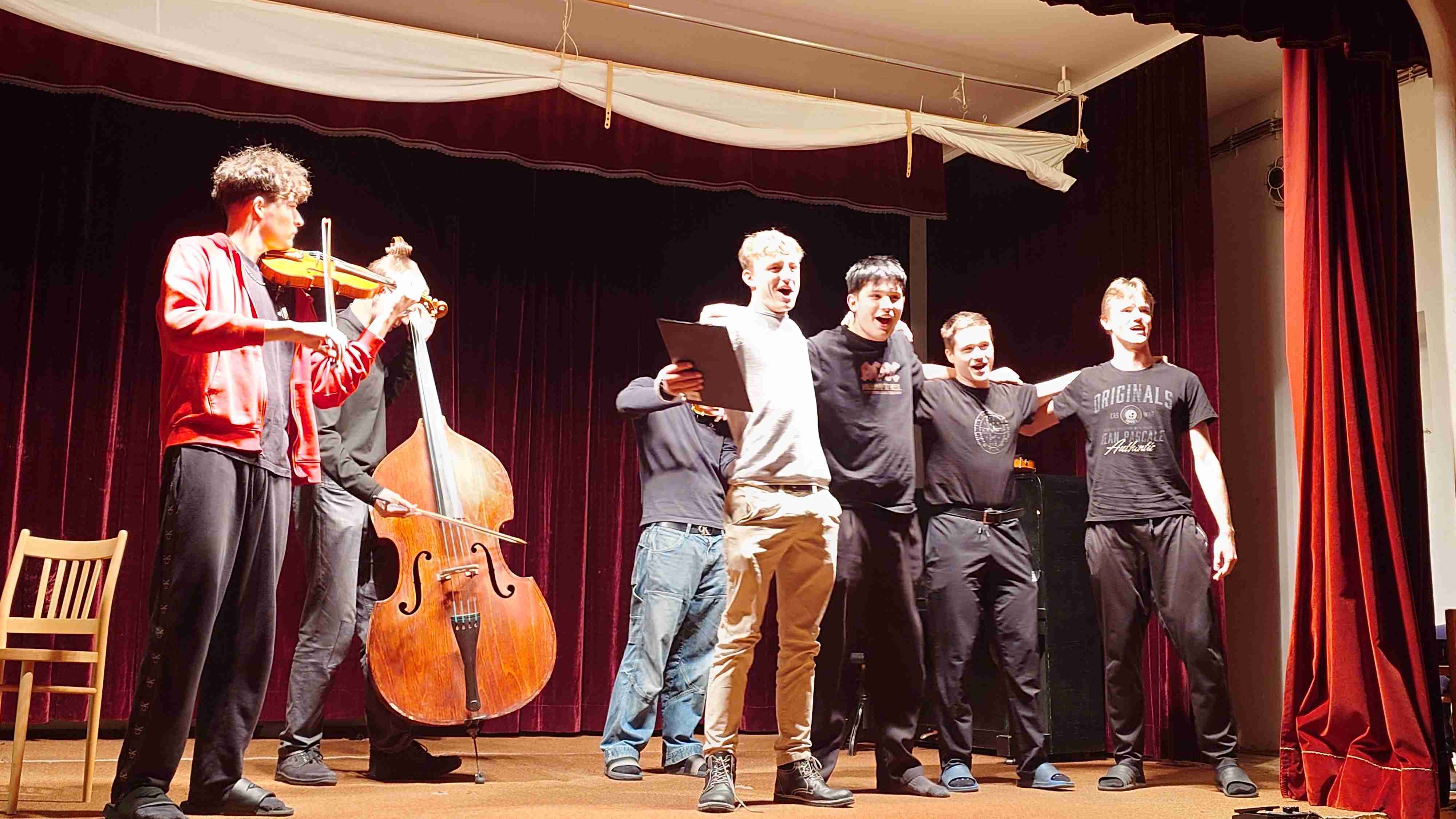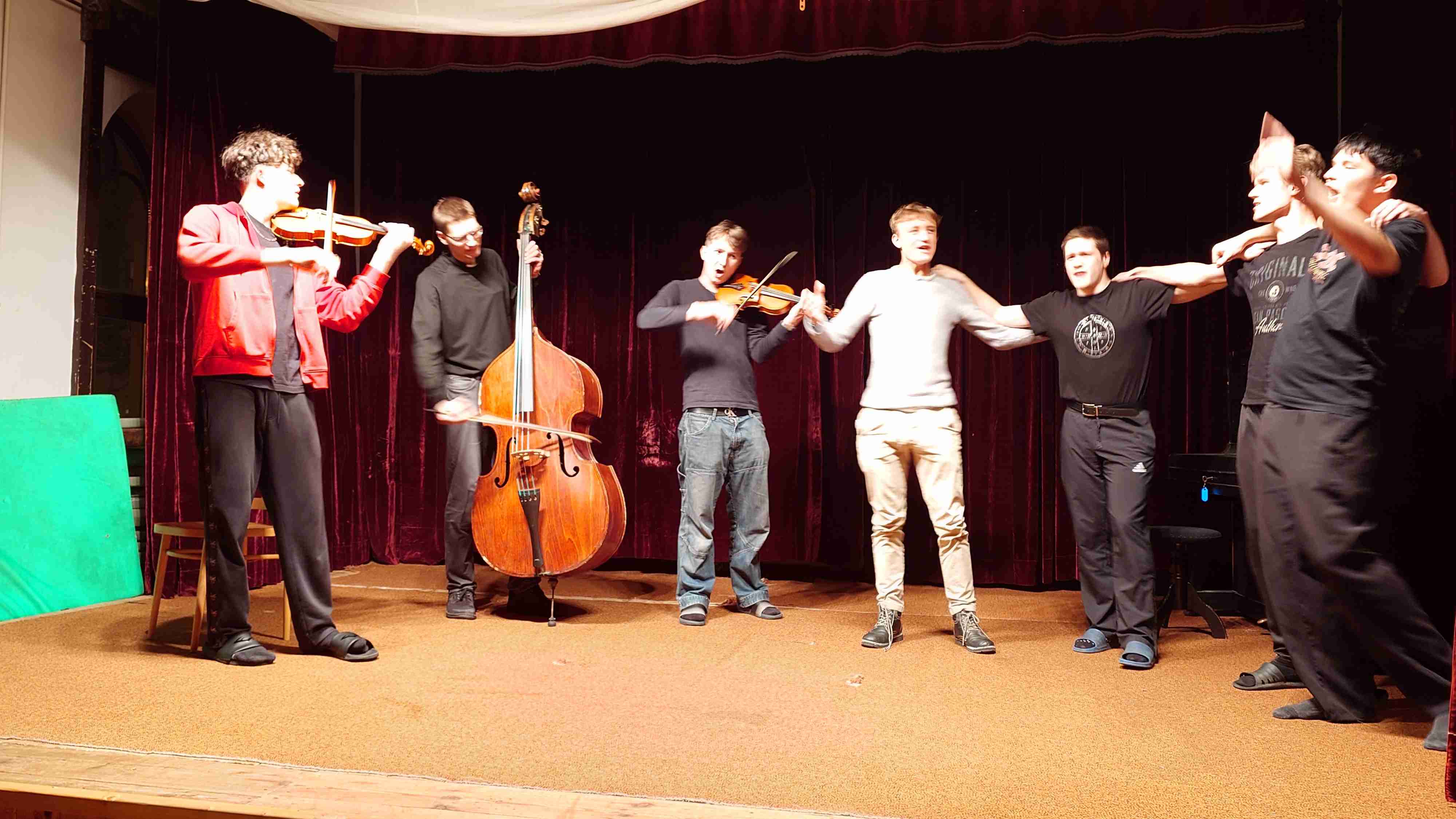 10) Scénka – 4 houslisti a 1 housle (padre, Pepa Ptáček, Marcel Alman, Víťa Přibil)