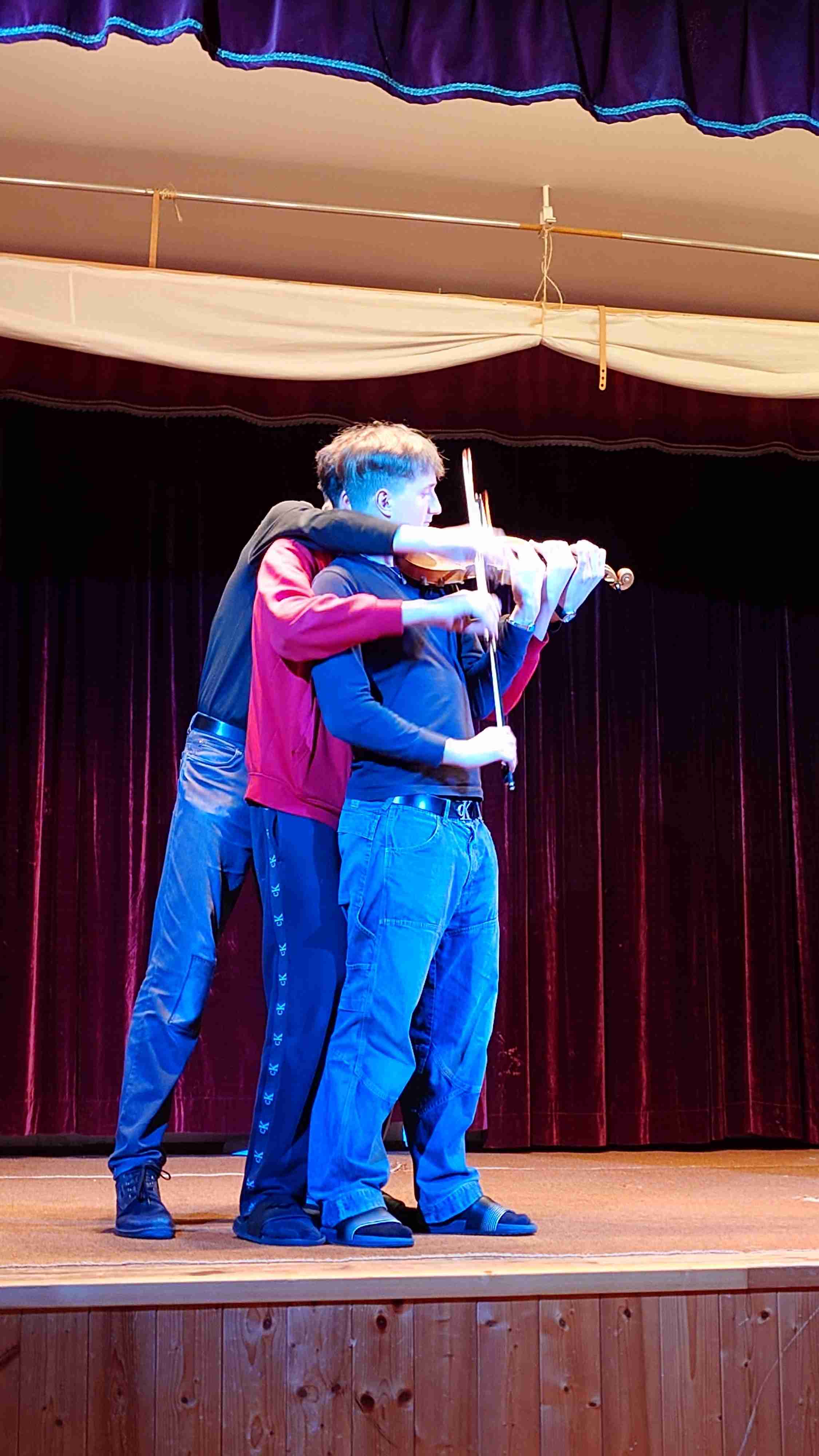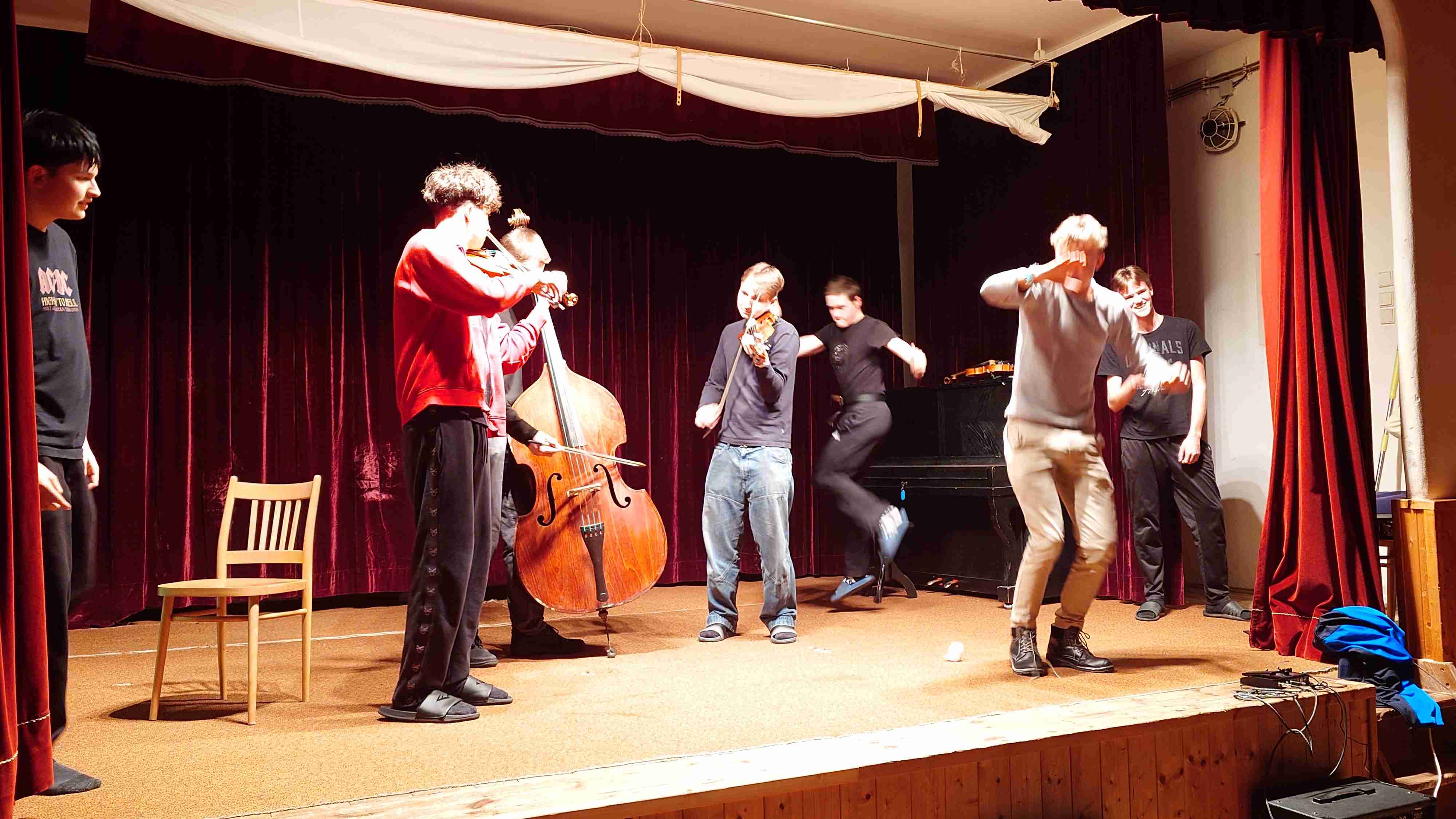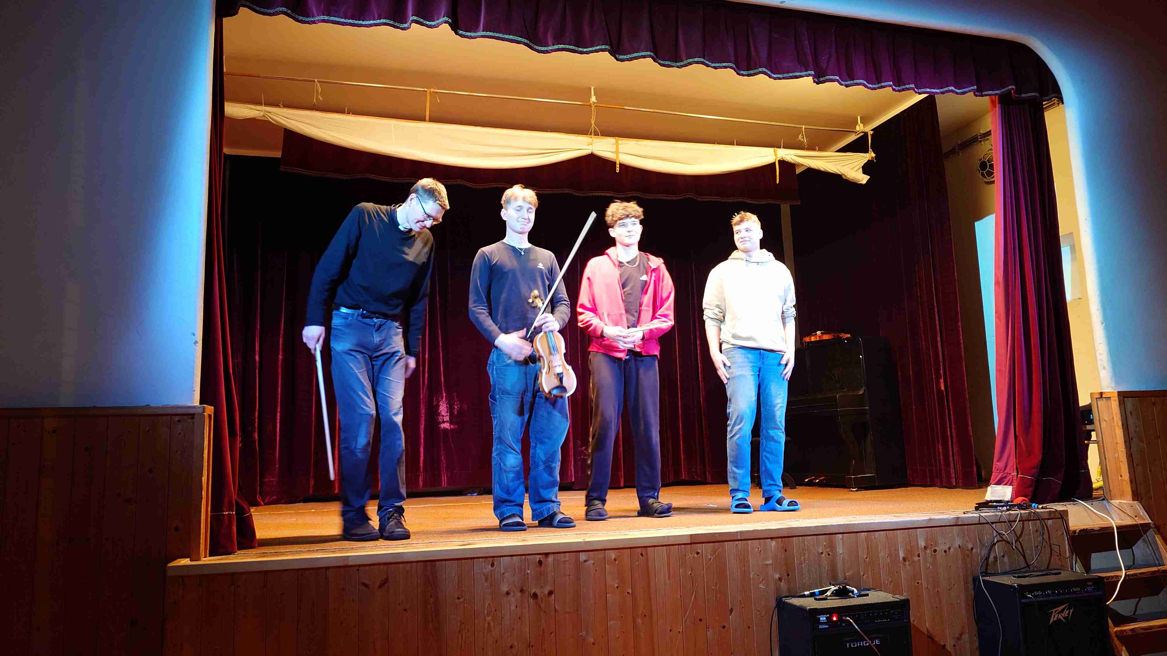 10) Scénka – 4 houslisti a 1 housle (padre, Pepa Ptáček, Marcel Alman, Víťa Přibil)
